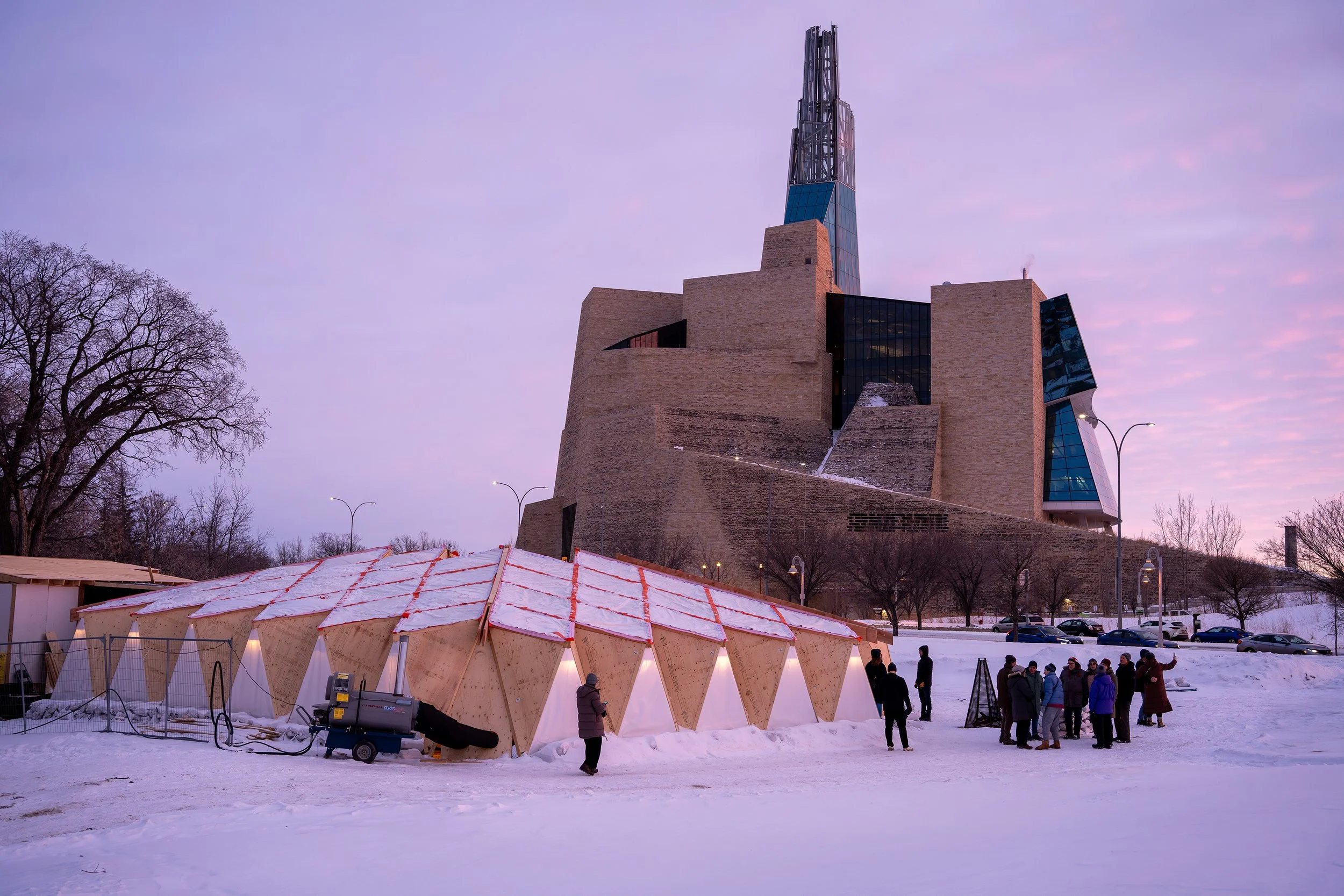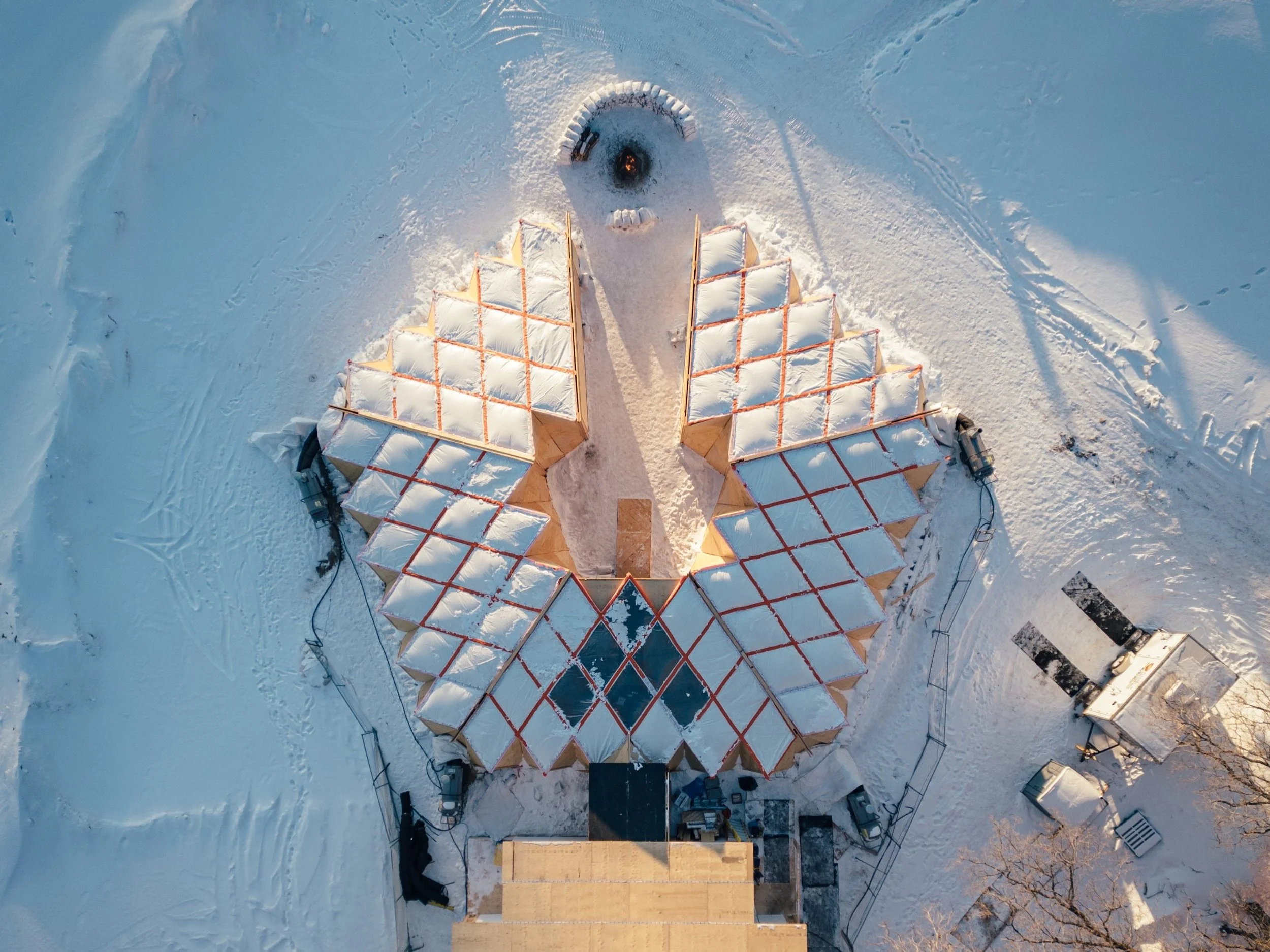 A pop-up restaurant built in 10 days in temperatures dropping as low as -47 degrees celsius with within chill in Winnipeg , Canada. The project reused materials from previous years and the gold inflatable panels designed in 2024.
