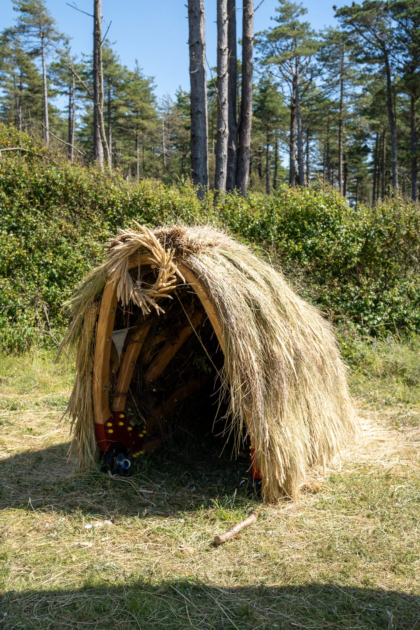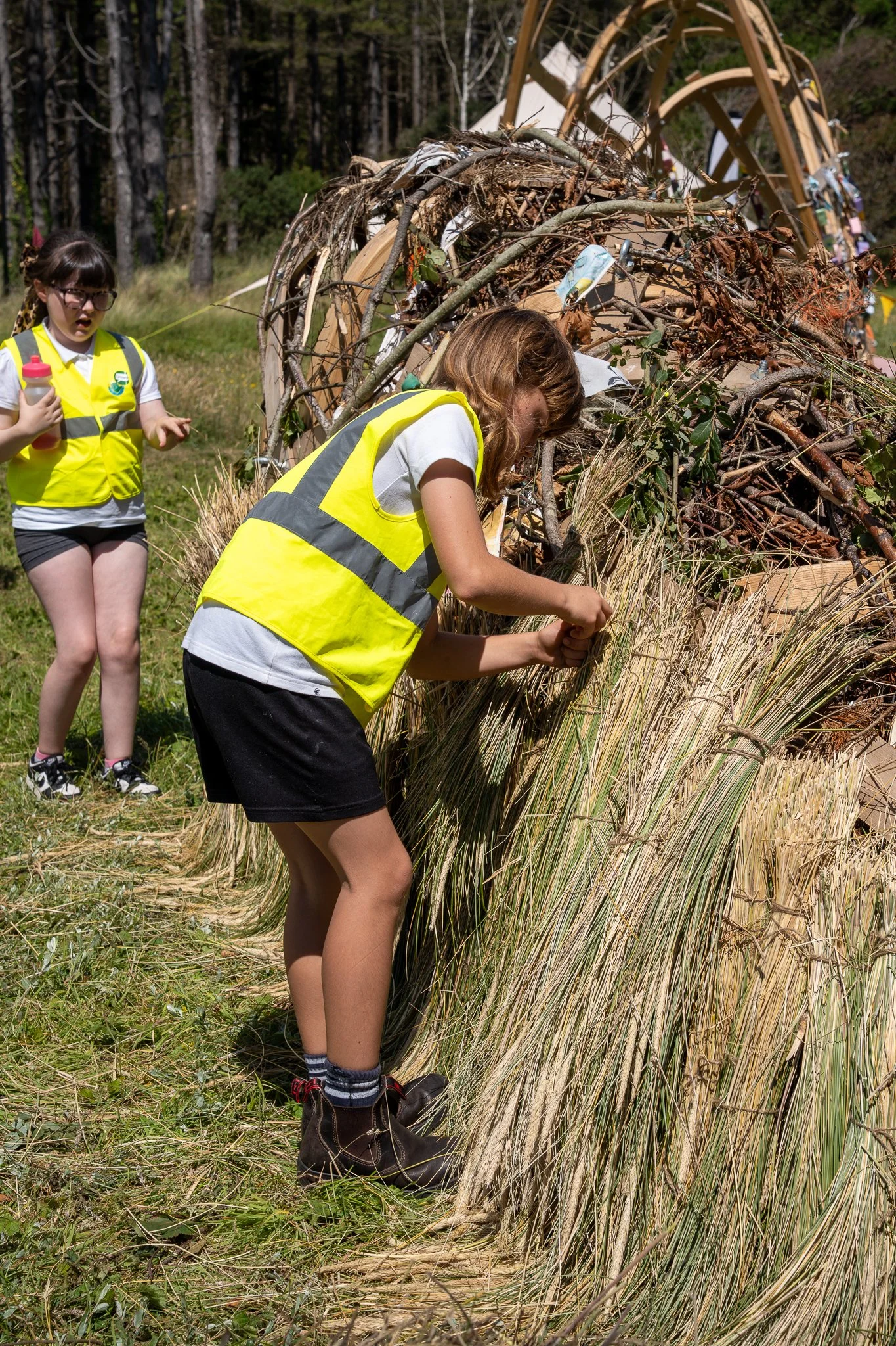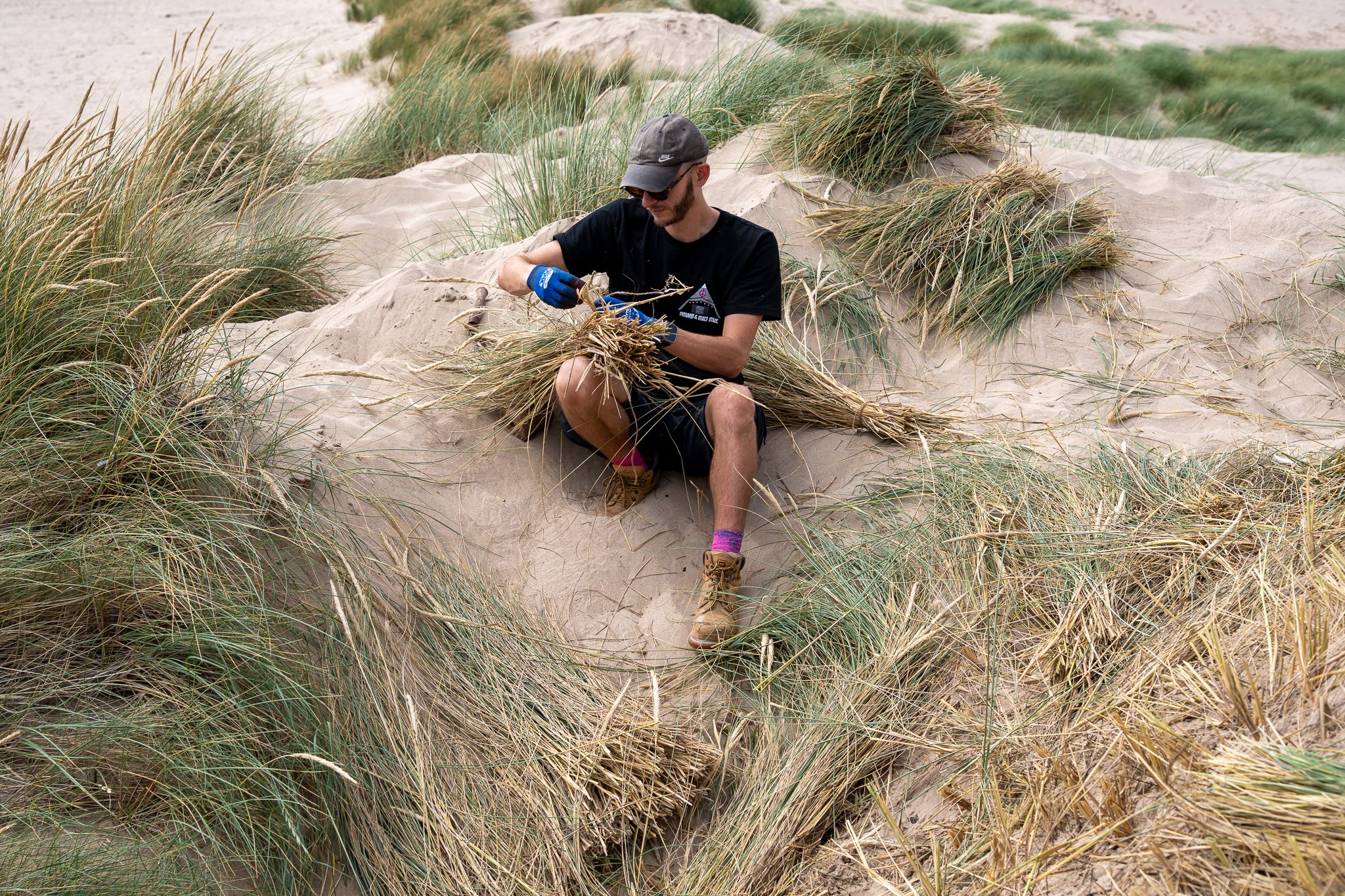 Working with Cyfoeth Naturiol Cymru (Natural Resources Wales), we harvested marram grass from the receding dunes at Newborough Beach, Anglesey, supporting the care of this rare coastal ecosystem. The harvested material was then used to thatch Loom 5 alongside school groups and the wider public.